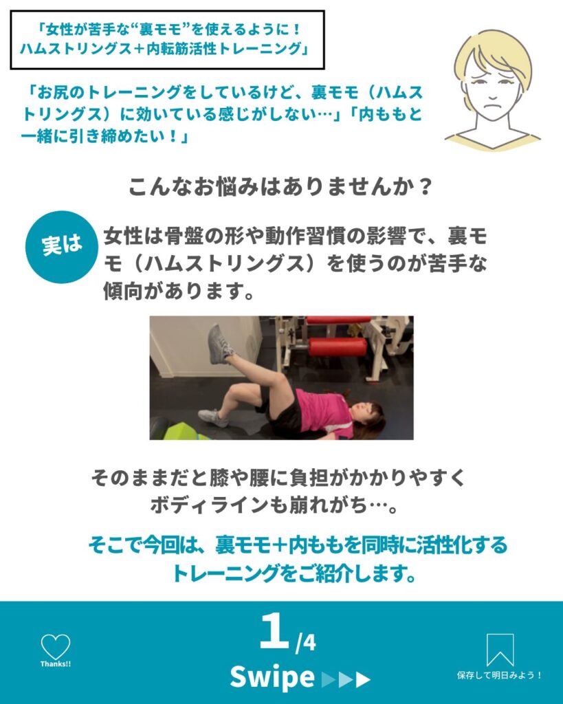 「お尻トレしているけど、裏モモに効いている感じがしない」「内ももも一緒に引き締めたい」——そんな声に応えます。